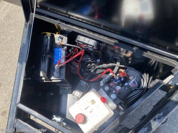 TARP IS INCLUDED. 17,500 LB GVWR (2) 8000 LB EZ Lube Axles with Brakes on both axles Adj Coupler Dual Cylinder Lift Barn Style Rear Gate 215/75R17.5 Radial Tires Lockable Tongue Box For Power Unit and Battery 6' rear Slide Out Ramps 10 GA Floor 12V On Board Charger Tread Plate Fenders Spare Tire Mount Only D-Rings In Floor Sealed Wiring Harness Breakaway Kit DOT Tape All LED Lights NATM Compliant **duplicate pics**