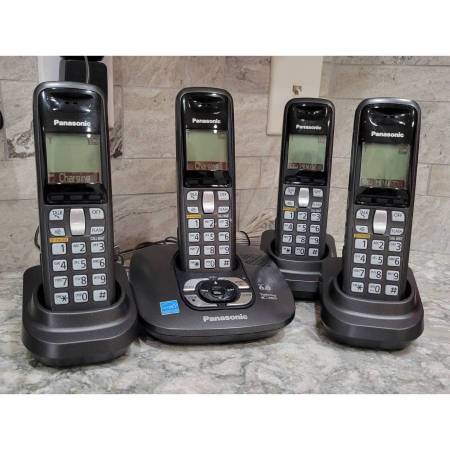 Panasonic DECT 6.0 cordless home phone answering machine set. Includes manual, home base, four handsets with docks, wall adapters and extension cord. Each handset operates on two 1.2V Ni-MH AAA rechargeable batteries (not included). Great condition, very light wear, all working, clean, clear read screens and buttons. Smoke and pet free. Will not sell individually.