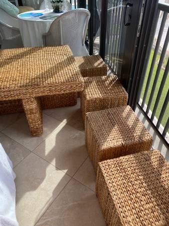 Beautiful braided grass woven table w 4 matching stools originally bought from Matter brothers furniture paid over $700. With $250. Beveled glass top.. very neutral. Only $ 125. and it is all yours. At sanibel harbour resort condo just before bridge.