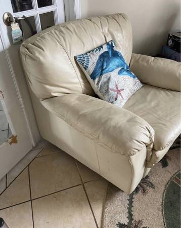 Over sized cream color leather sofa in very good condition. There is a slight mark on the right back corner as seen in photo Great comfy chair
